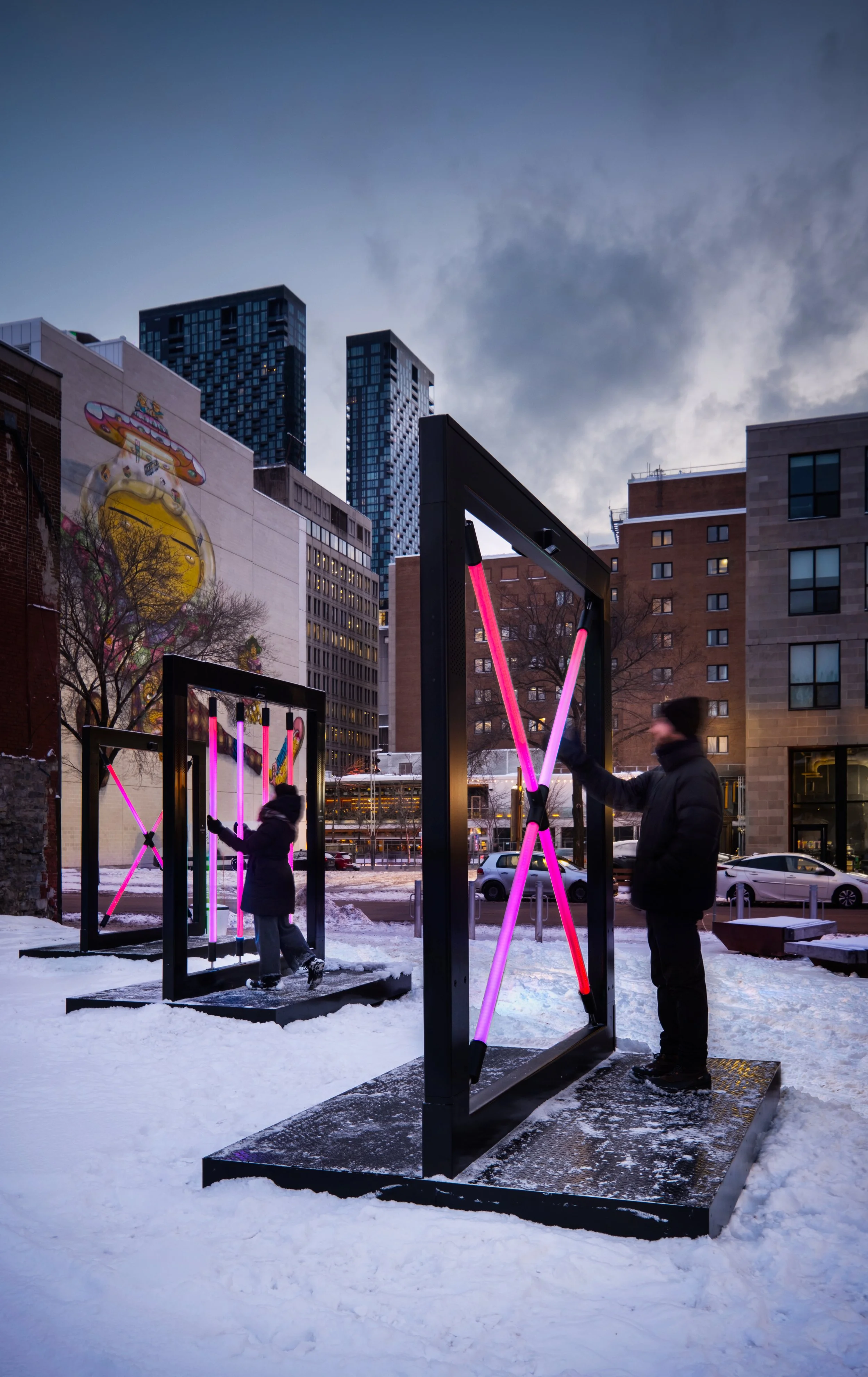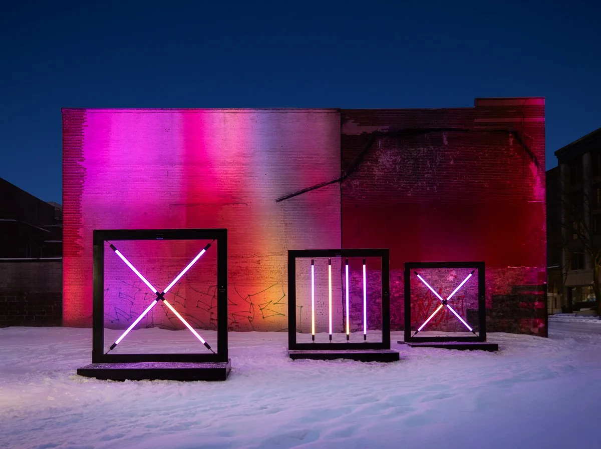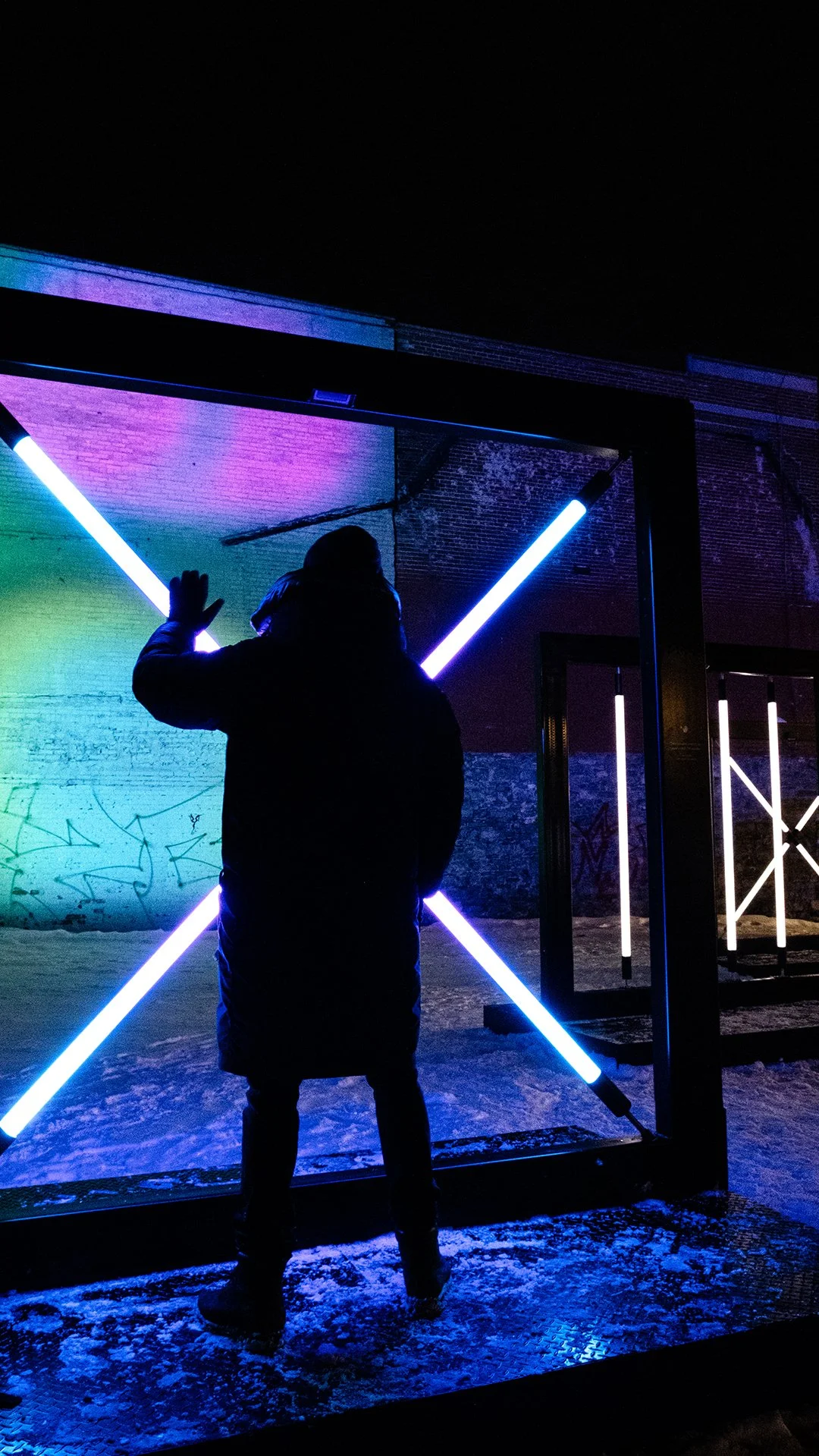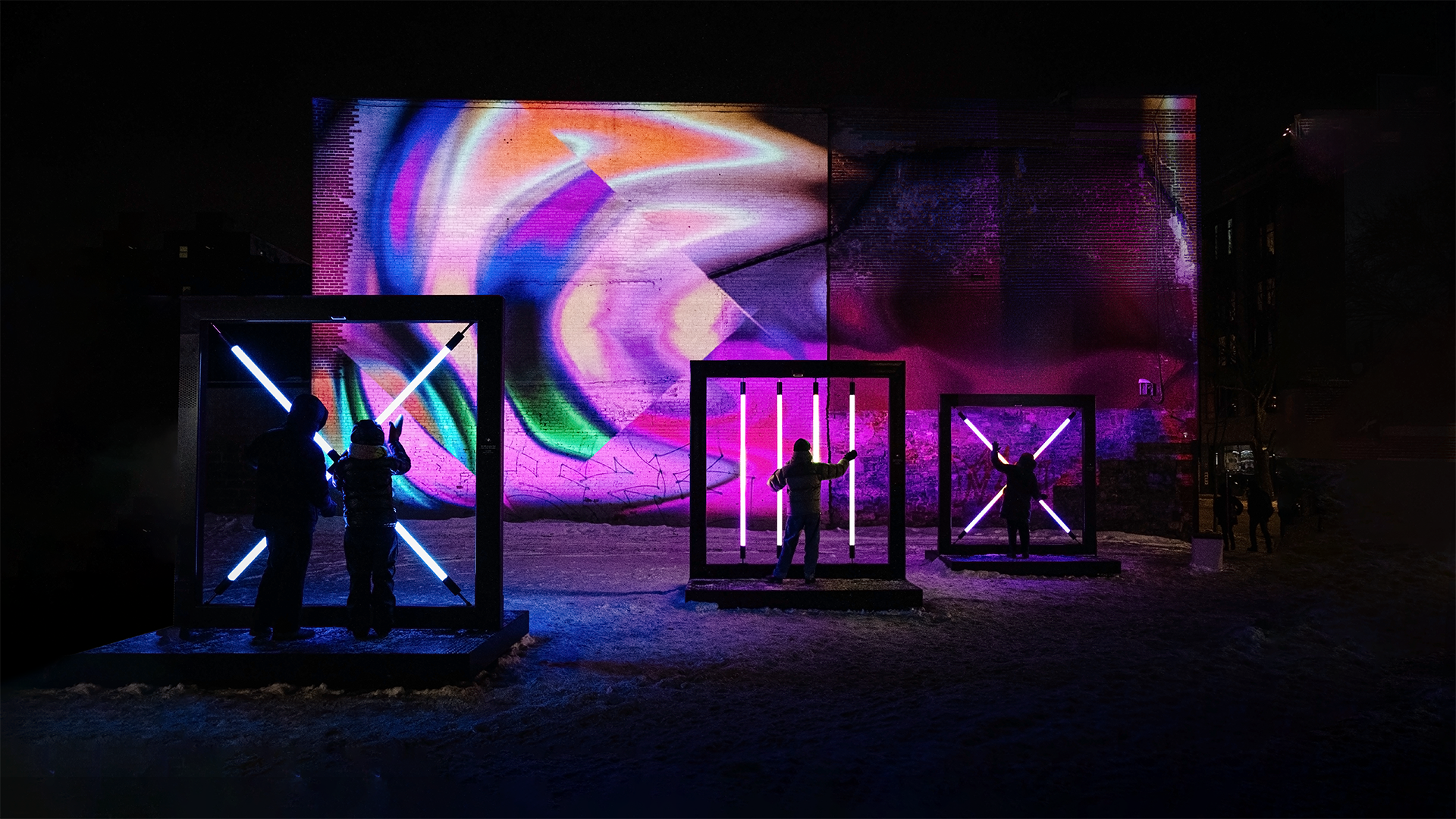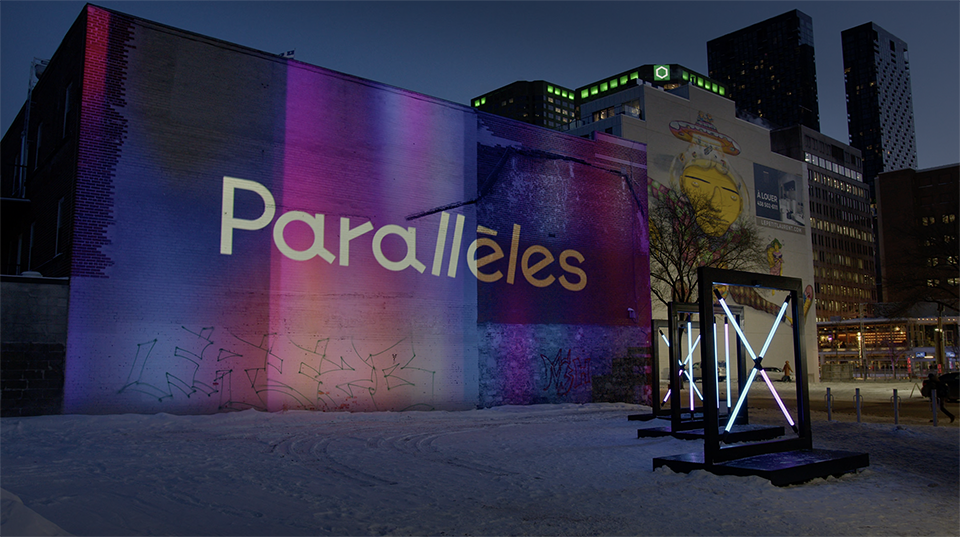 Parallèles est une expérience pour l’espace public où lumière, son et projections architecturales réagissent en temps réel. Les manipulations de tubes lumineux révèlent des auras colorées, transformant l’espace urbain en terrain de jeu collectif.